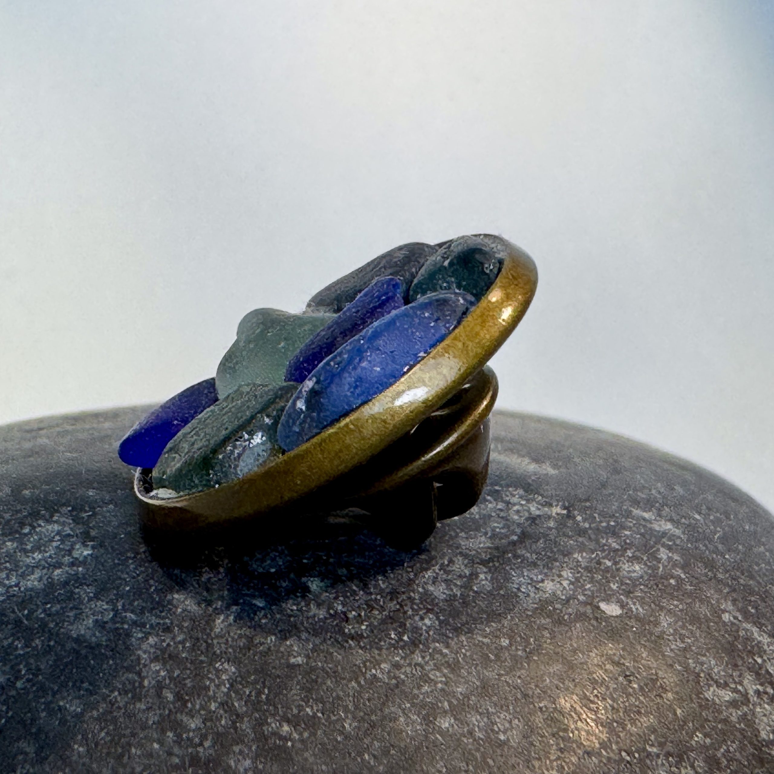 Tiny nuggets of genuine English sea glass shine in this Mosaic Clutch Pin. The brass clutch pin can be used on a hat, a bag, or lapel. Share your love of this sea with this colorful palette of frosty English sea glass.