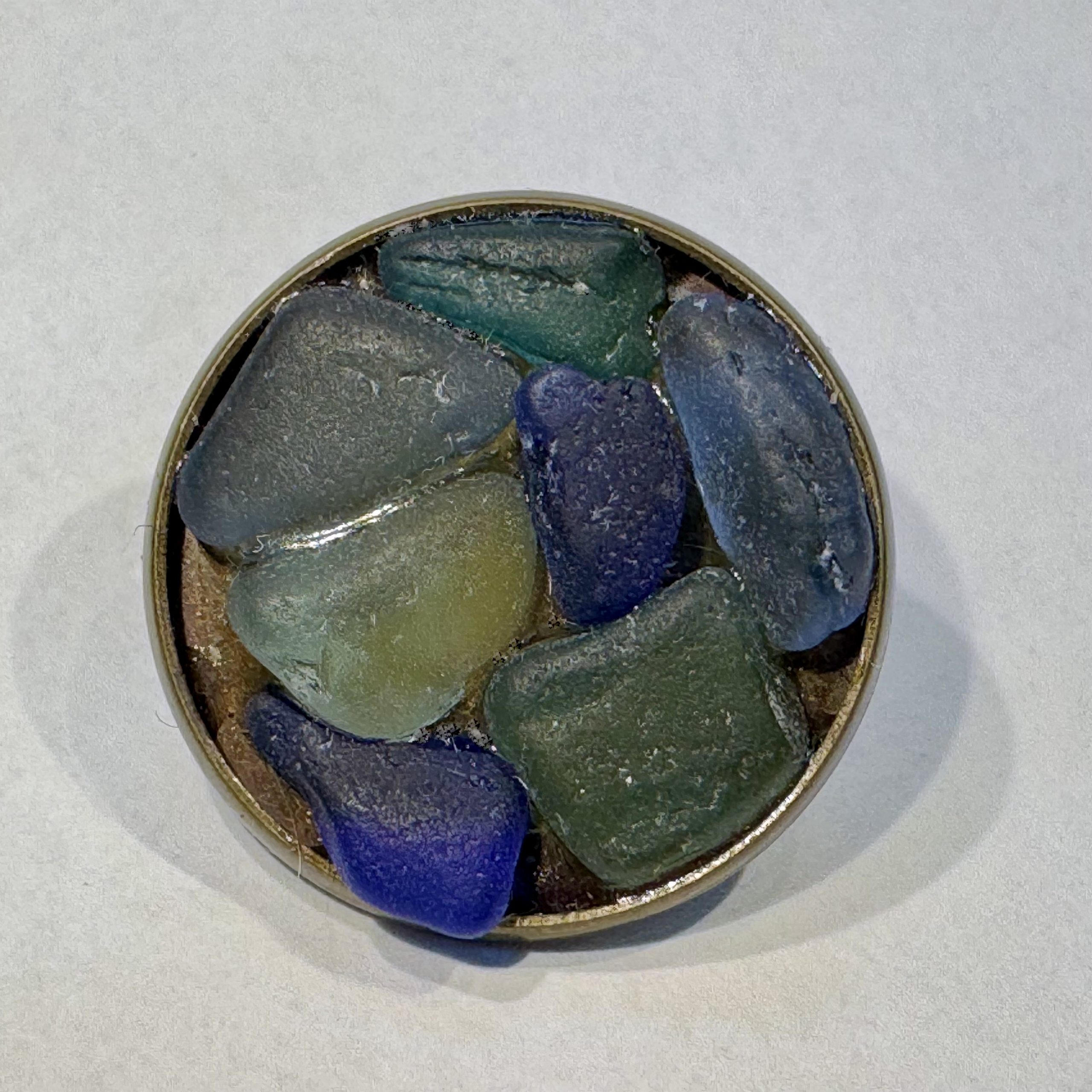 Wear your love of the sea on a hat, scarf, or lapel with this colorful mosaic of ocean-tumbled English sea glass nestled inside a brass clutch pin.