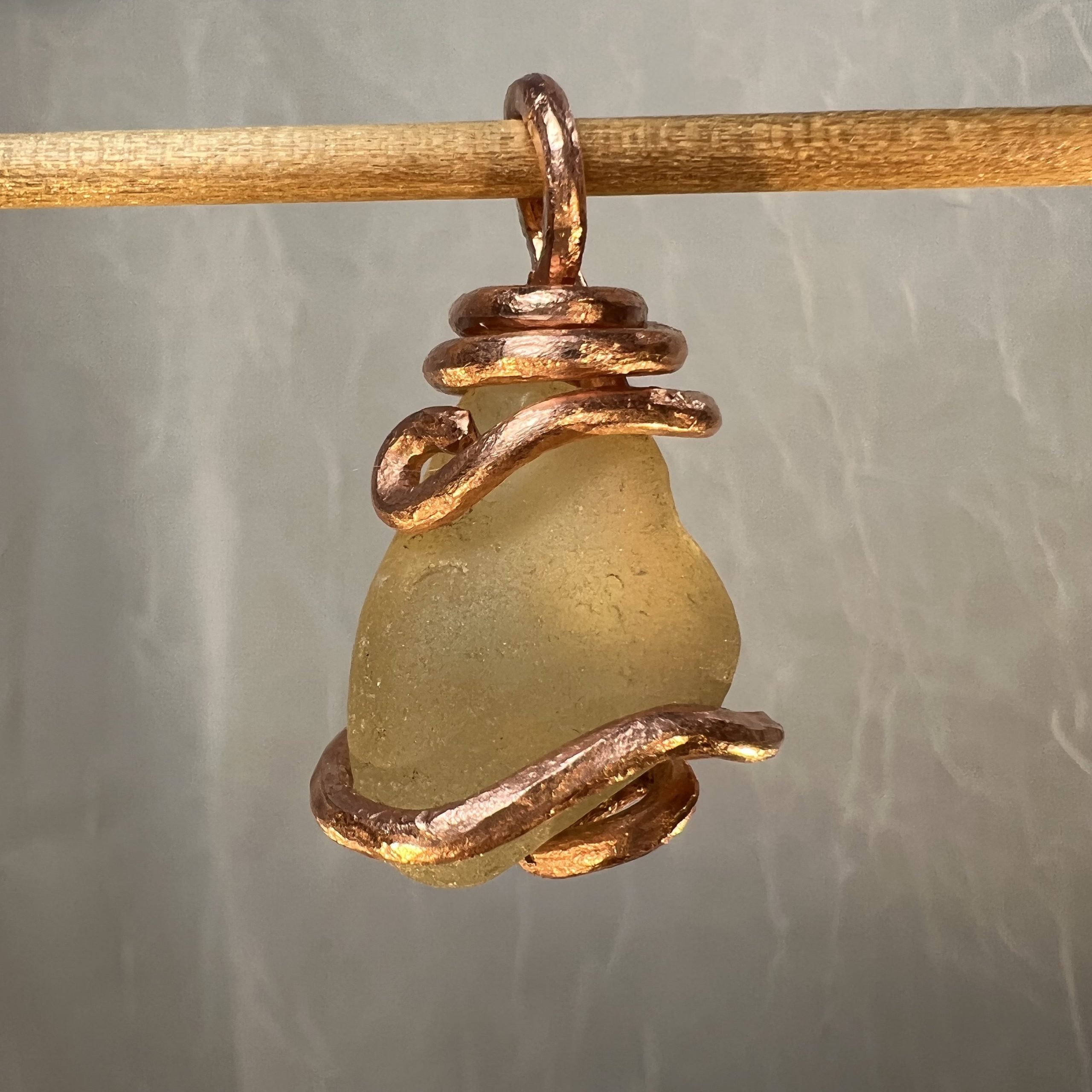 A nugget of pale yellow sea glass pendant is wrapped in a setting of hammered copper. The sea glass was found on the shores of the Sea of Japan and is fashioned in the style of an ancient mariner. This mystical charm radiates good fortune from the sea.