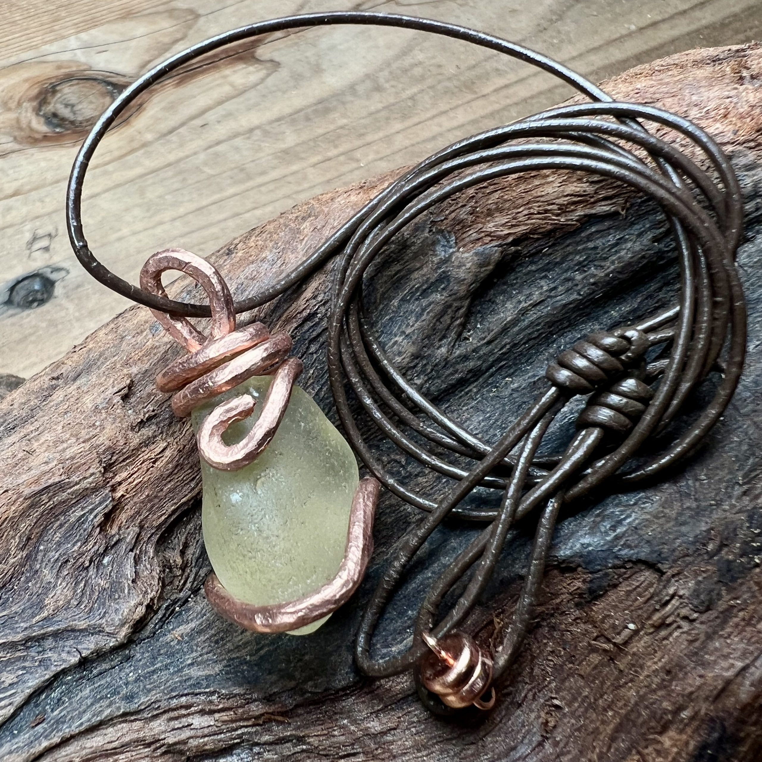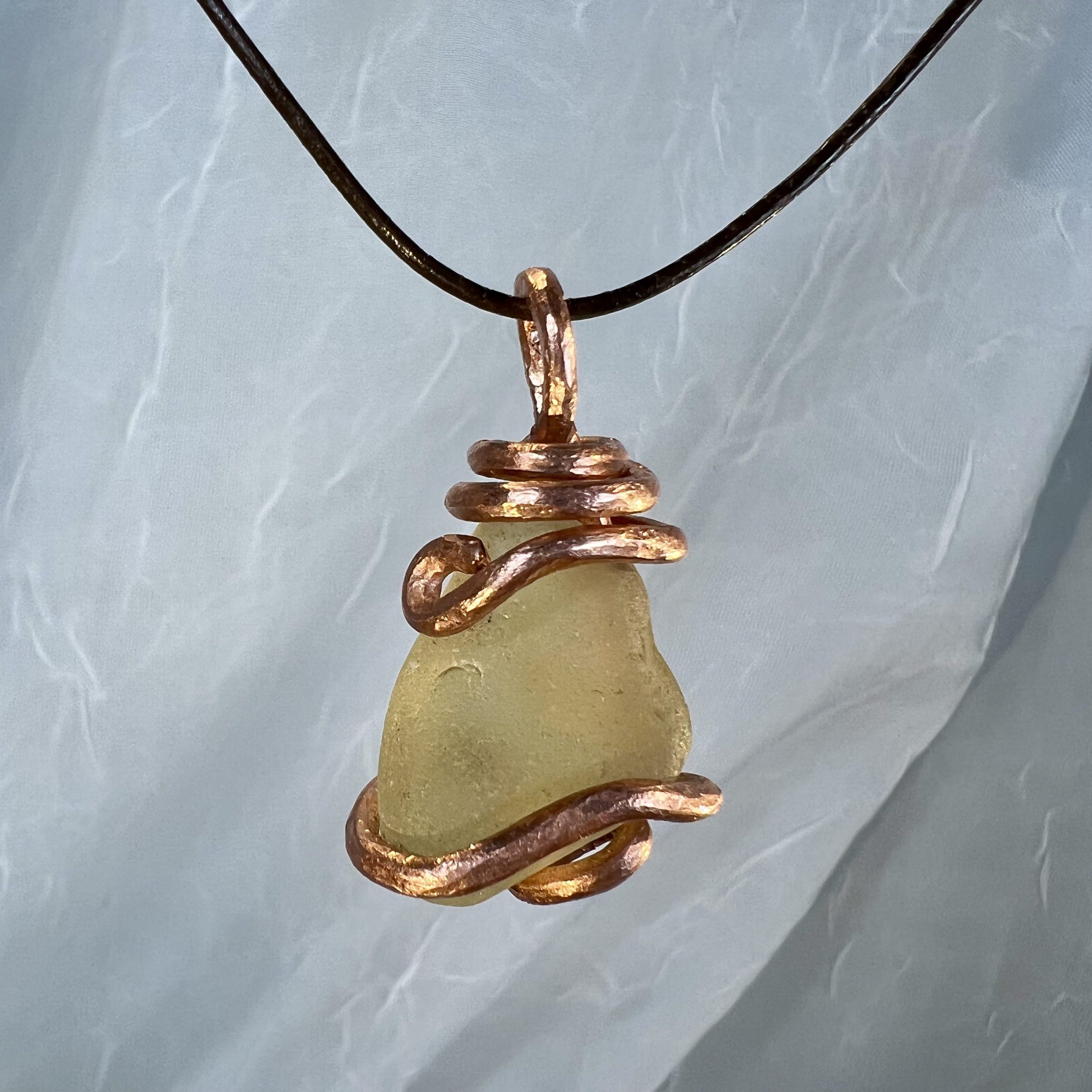 SKU: #2213 Category: Distant Tides Sea Glass Tags: Adjustable Leather Cording, Ancient Mariner Pendant, Copper Magnets, Hammered Copper, Pale Yellow Sea Glass, Sea Glass, Sea Glass Pendant, Sea of Japan Sea Glass